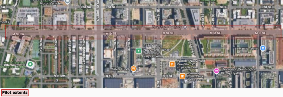 The Intelligent Transportation Society of America (ITS America), DC Highway Safety Office (DC HSO), District of Columbia Department of Transportation (DDOT) Vision Zero Office, and the DC Southwest Business Improvement District (SWBID) are proud to present the M Street Road Safety Technology Reverse Pitch and Pilot in the Navy Yard Neighborhood of Washington, DC, USA. The pilot area is M Street from Delaware Avenue SW to 5th Street SE, 50 feet on either from the M Street centerline, as shown below and in the hyperlinked source PDF.